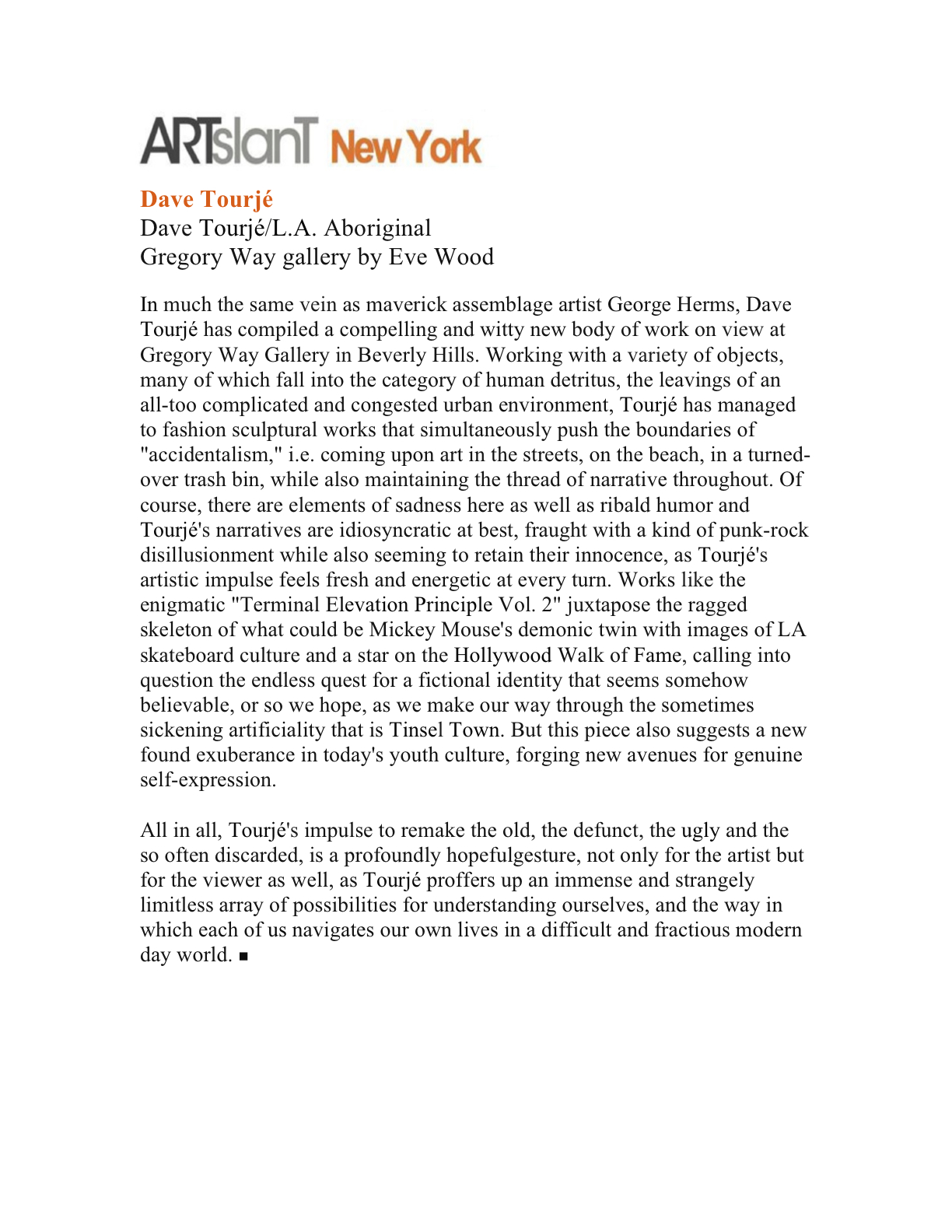September 30, 2011 ARTslant New York, September 30, 2011 – Dave Tourjé/L.A. Aboriginal Gregory Way gallery PDF READ MORE Leonardo Vargas in Press 0 Likes