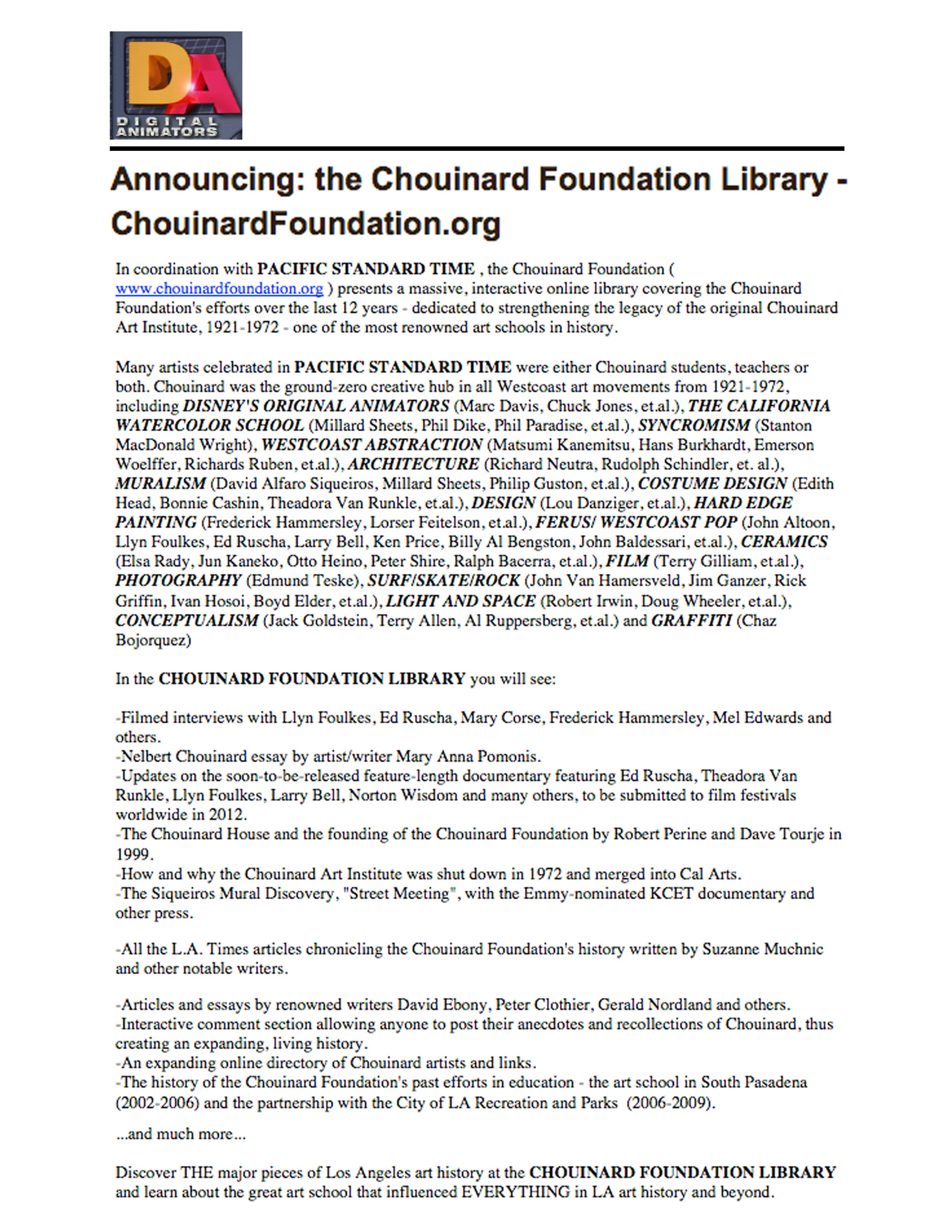 January 3, 2012 Digital Animators, January 3, 2012 – Announcing: the Chouinard Foundation Library – ChouinardFoundation.org PDF READ MORE Leonardo Vargas in Press 0 Likes