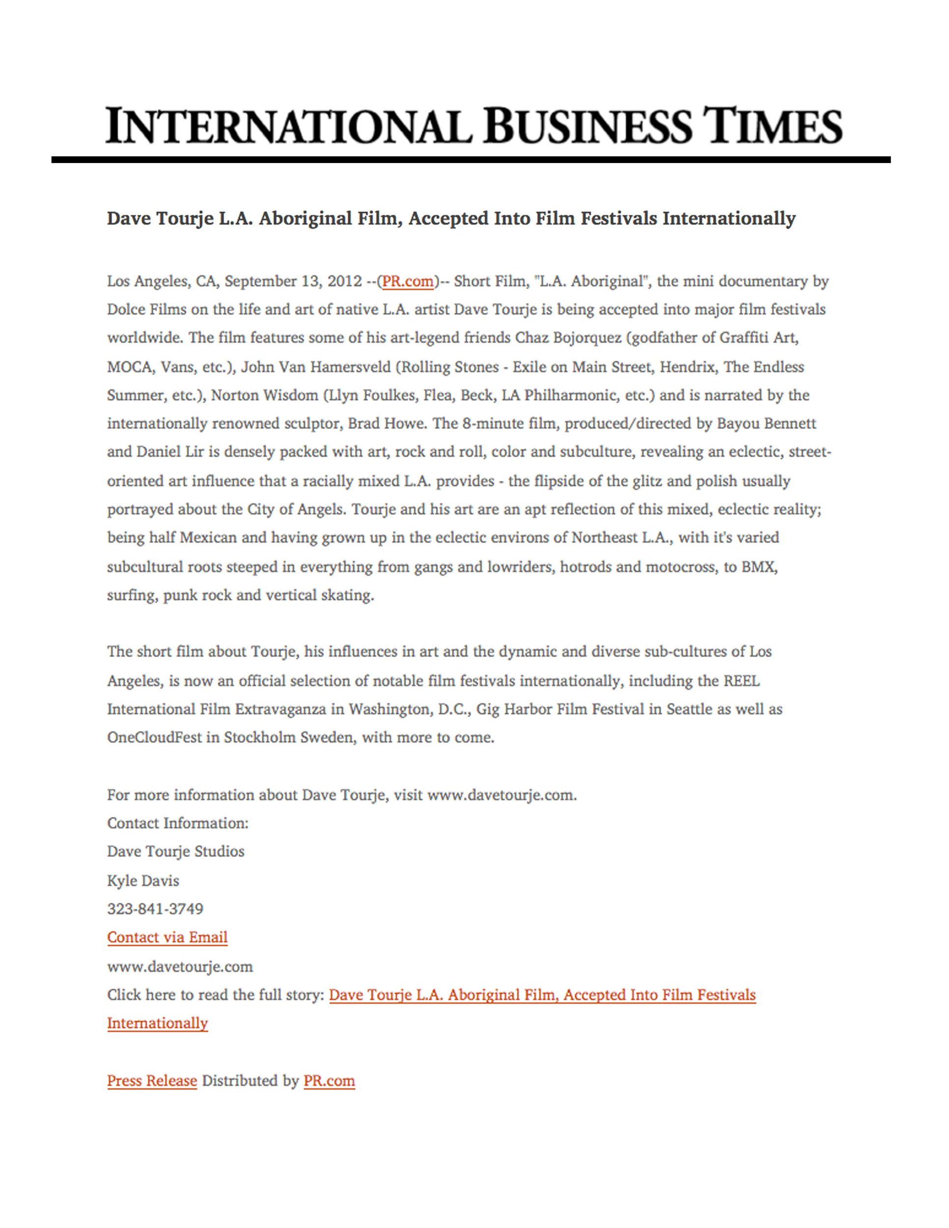 September 13, 2012 International Business Times, September 13, 2012 – Dave Tourjé L.A. Aboriginal Film, Accepted Into Film Festival Internationally PDF READ MORE Leonardo Vargas in Press 0 Likes