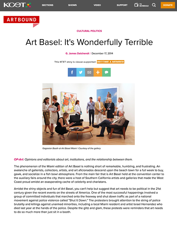 December 17, 2014 KCET, December 17, 2014 – Art Basel: It’s Wonderfully Terrible PDF READ MORE Leonardo Vargas in Press 0 Likes